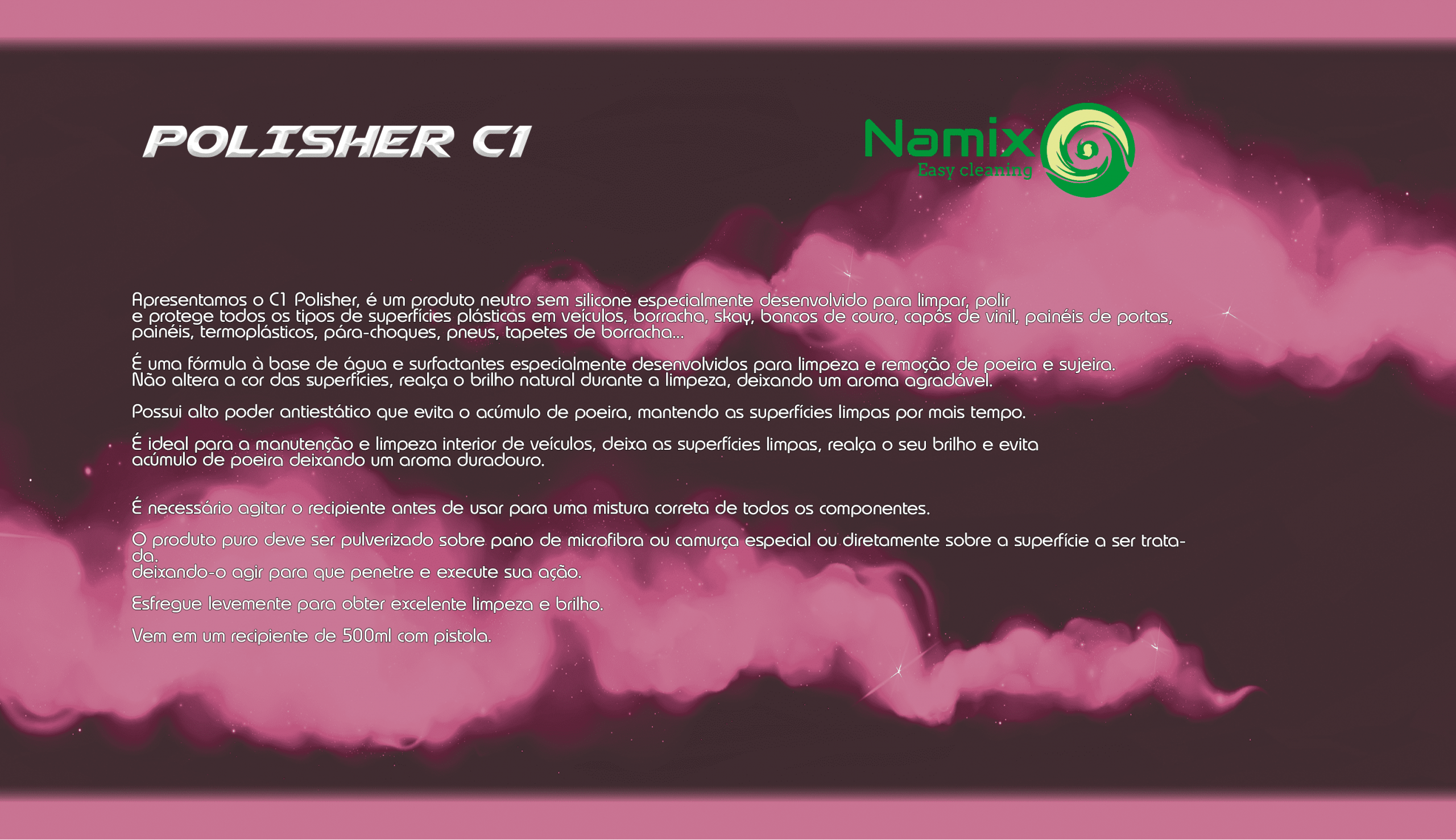 Easy cleaning Apresentamos o C1 Polisher, é um produto neutro sem silicone especialmente desenvolvido para limpar, polir e protege todos os tipos de superfícies plásticas em veículos, borracha, skay, bancos de couro, capôs de vinil, painéis de portas, painéis, termoplásticos, pára-choques, pneus, tapetes de borracha...