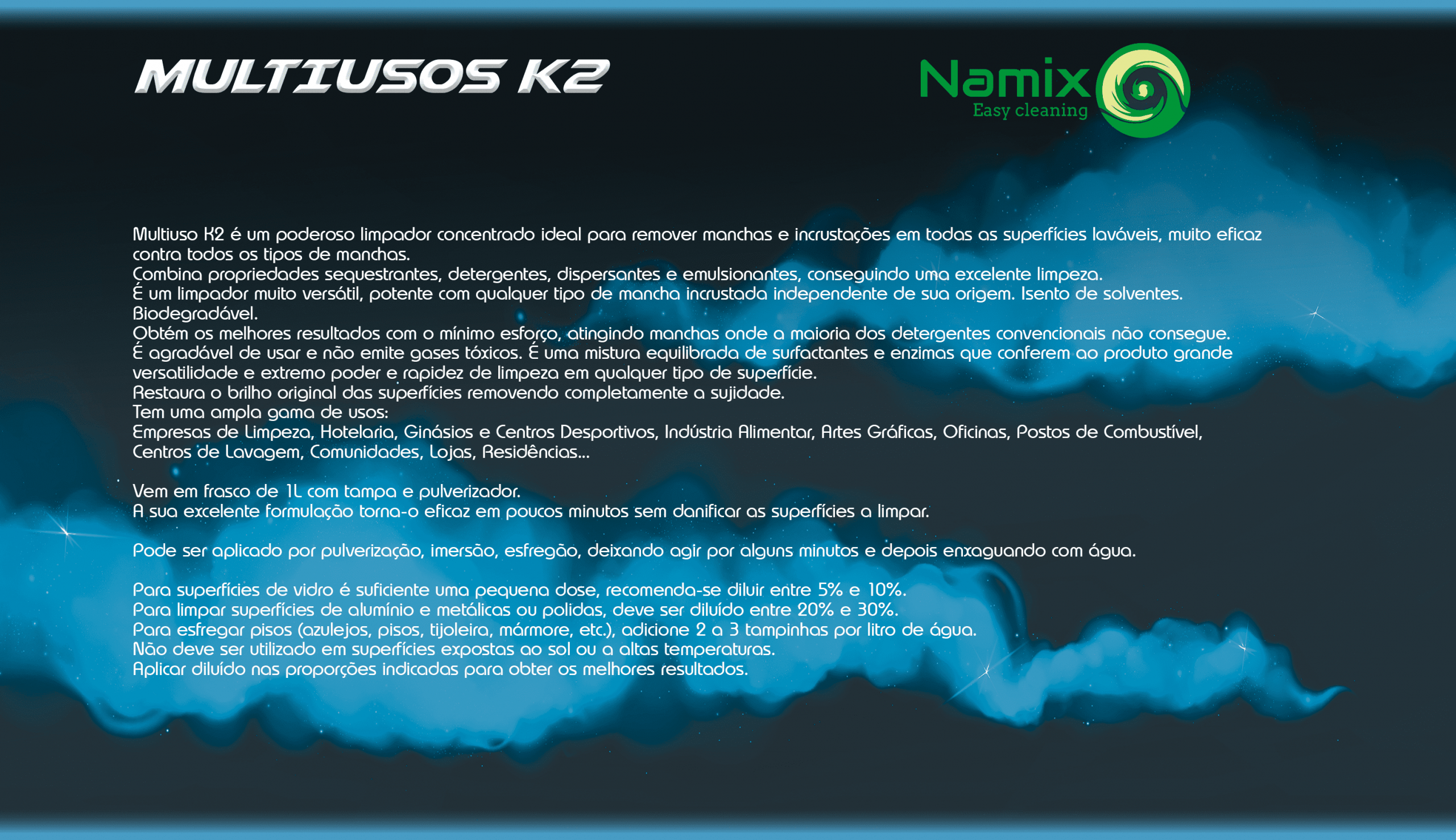 Multiuso K2 é um poderoso limpador concentrado ideal para remover manchas e incrustações em todas as superfícies laváveis, muito eficaz contra todos os tipos de manchas.